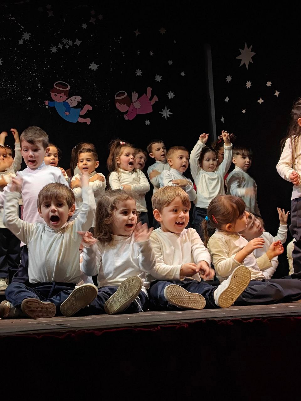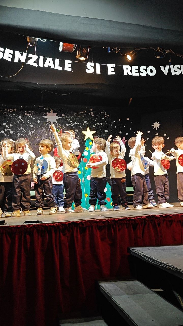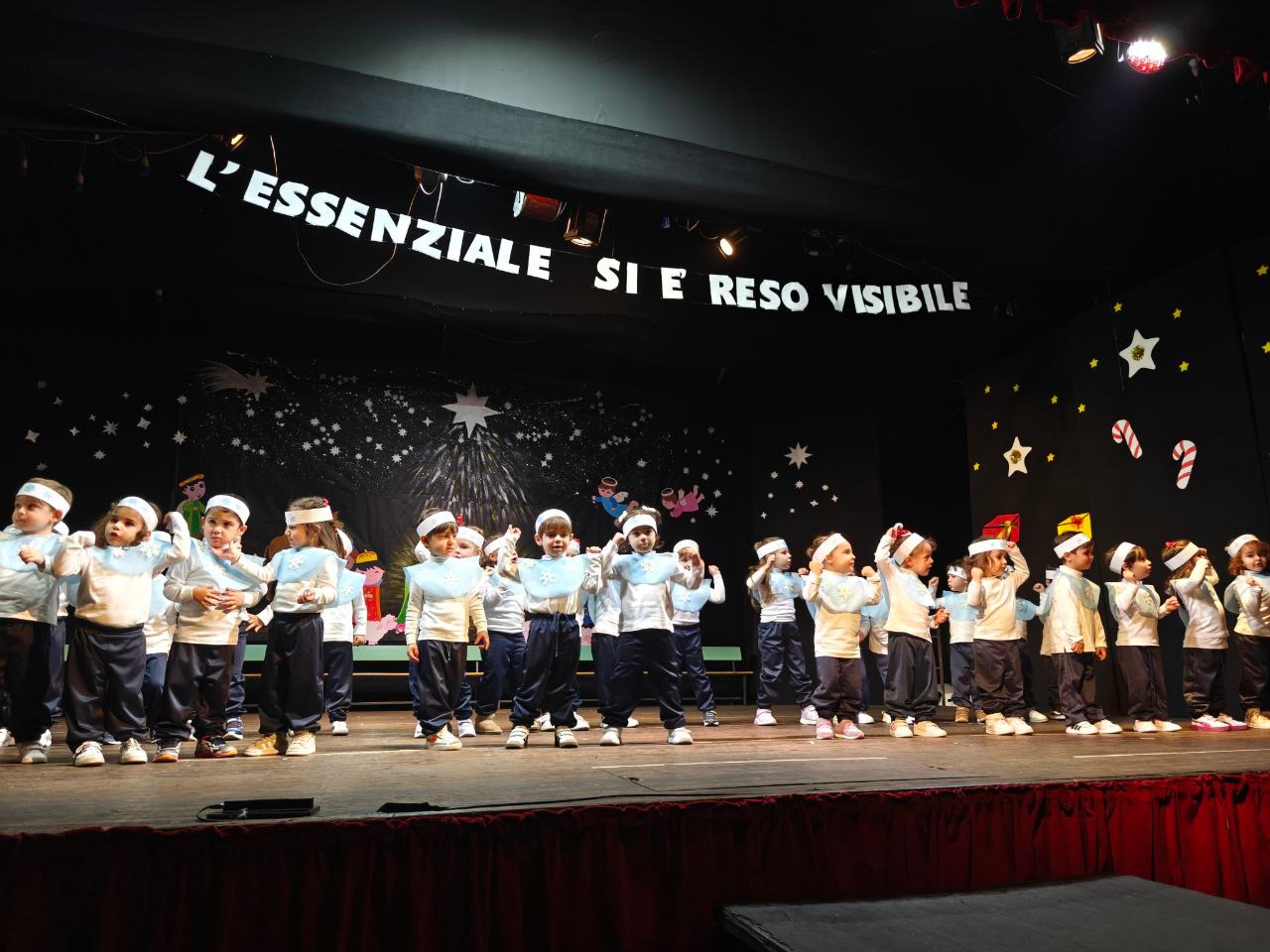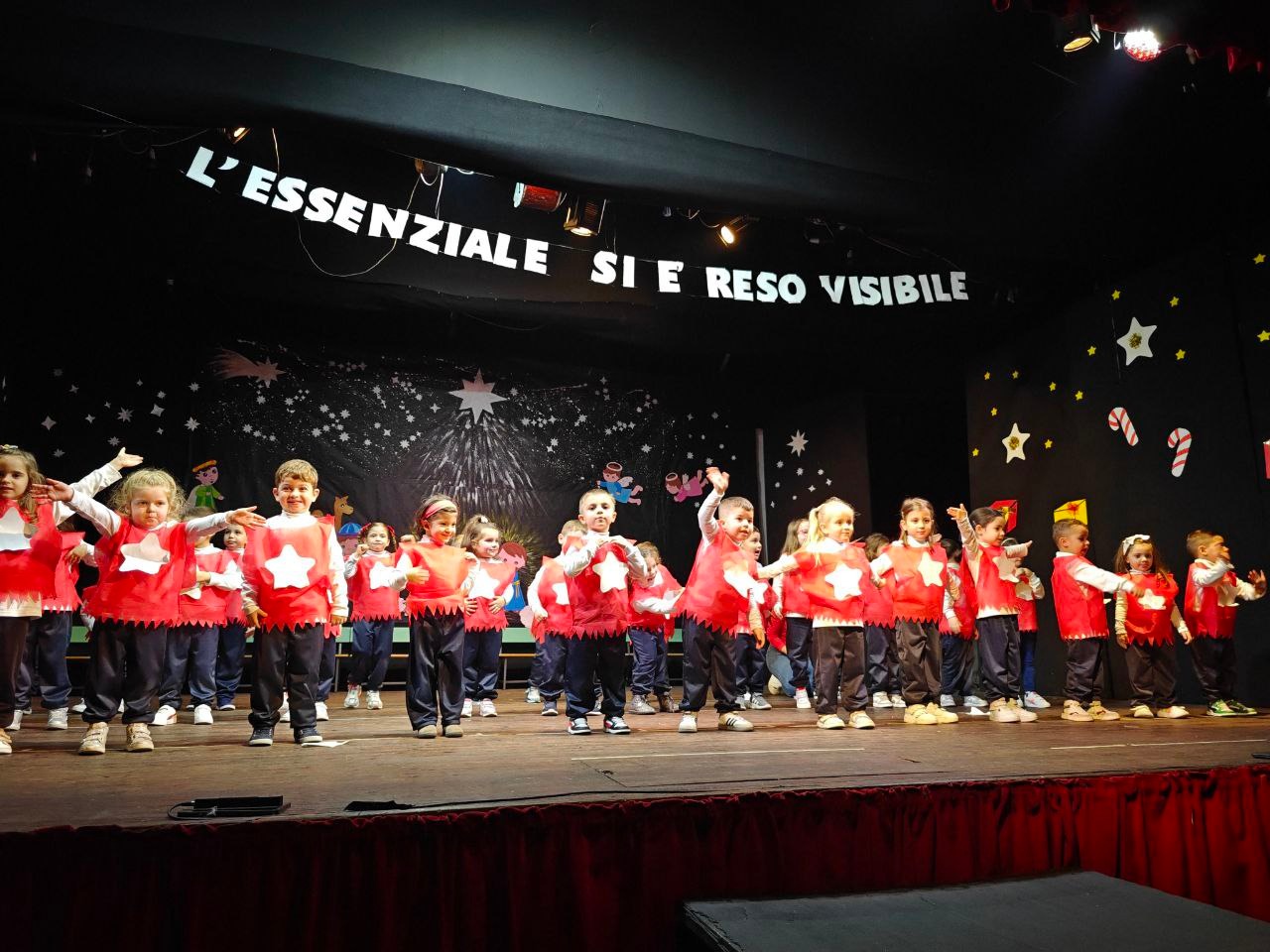 Le classi dei tre e quattro anni hanno, invece, allietato le famiglie con le coreografie ispirate ai simboli del Natale: luci, palline e regali hanno preso vita sul palco. Ogni scena è stata aperta da una dolce voce narrante che preparava gli spettatori al magico clima della festa e li accompagnava nel racconto. Le famiglie hanno, con enorme sorpresa, potuto vedere l’autentico e gioioso coinvolgimento anche dei più piccoli che salutavano e saltavano con naturalezza. Tutti hanno seguito le insegnanti nei vari passi di danza, nei canti e nelle filastrocche anche in lingua inglese dando prova, con successo, delle settimane impegnate nei preparativi.